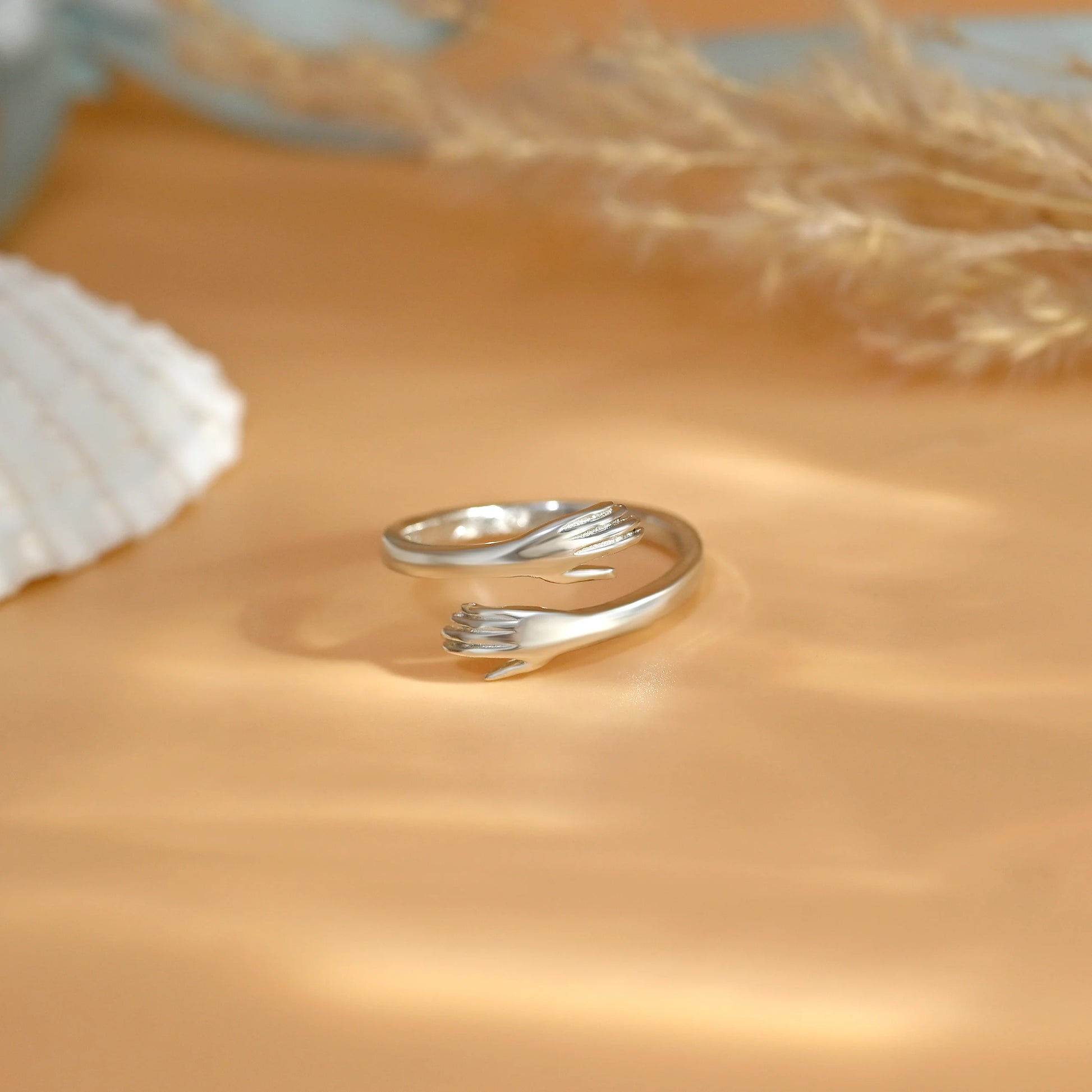 - Introducing the KYAT Elegant Hand-Inspired Adjustable Silver Ring, a stunning and symbolic accessory that blends modern minimalism with heartfelt meaning. This beautiful open-ended ring is crafted from 925 sterling silver, featuring two finely sculpted hands reaching toward each other. The design conveys a sense of connection, unity, and care, making it a truly unique and thoughtful piece.