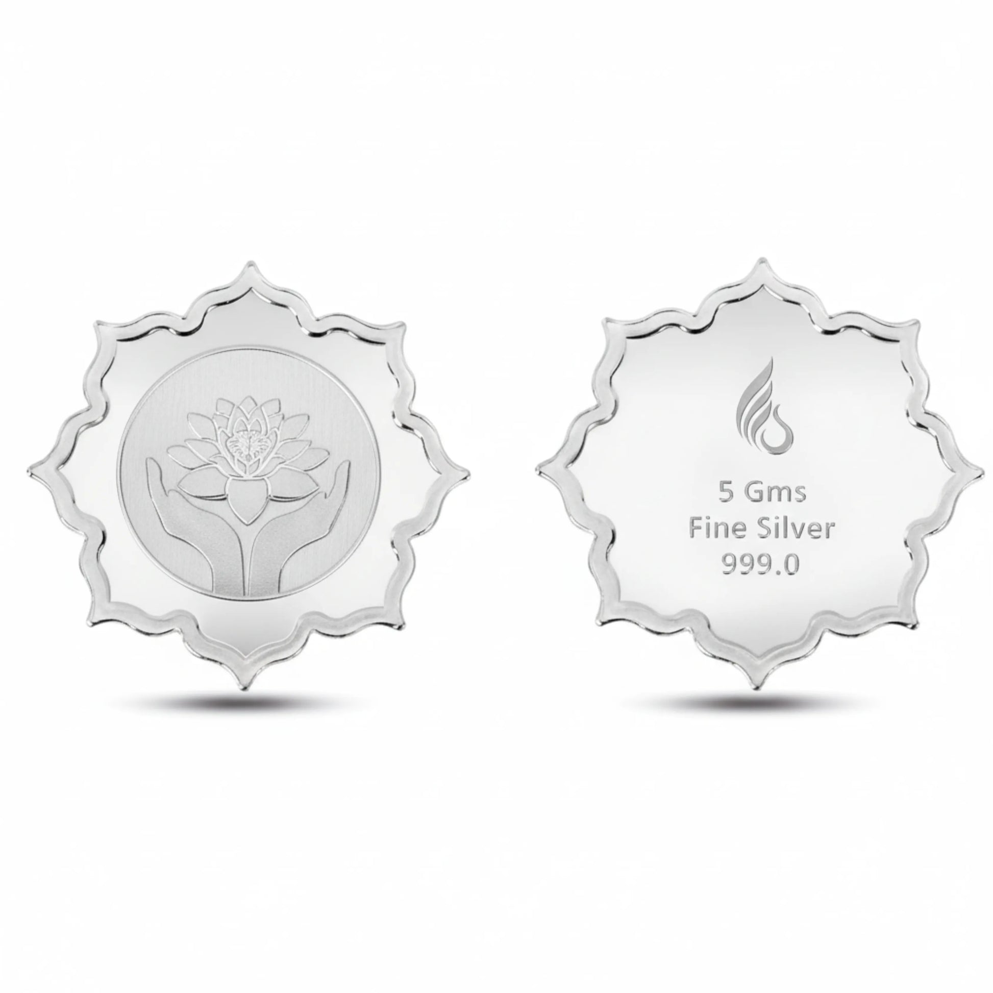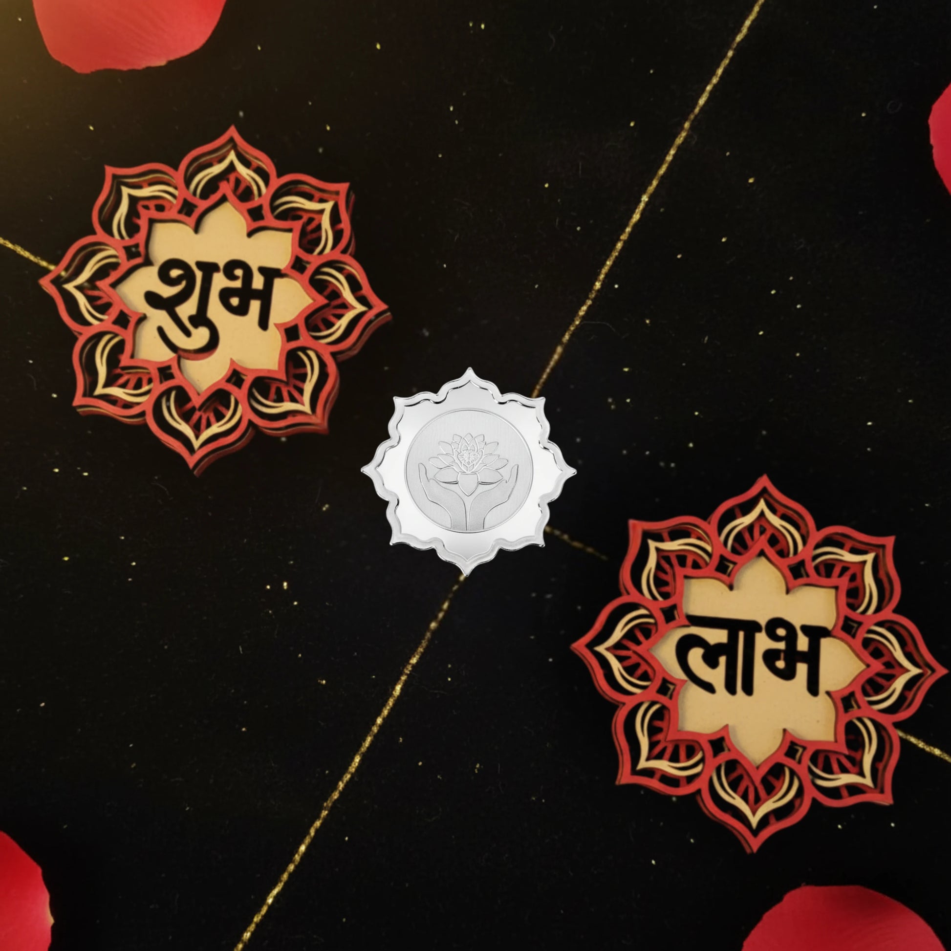 Celebrate purity and prosperity with the KYAT 5 Gram 999 Pure Silver Lotus Coin with wooden Subh-Labh. Crafted in fine silver with 999 purity, this elegant coin features a beautifully embossed lotus design, symbolising peace, growth, and positivity. With its intricate detailing and premium finish, it’s an ideal choice for festive gifting, auspicious occasions, or as a timeless addition to your silver collection.
